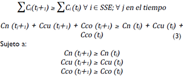 En este sentido, la sostenibilidad de los capitales se expresa bajo un sistema de ecuaciones que mide el estado de cada capital Ci en dos momentos del tiempo para todos los Ci que conforman el sistema. A través de este sistema de ecuaciones, se compara el estado o nivel de cada capital Ci en un momento inicial del tiempo tj, con el nivel del capital Ci en un momento futuro tj+1 para todo i que conforme el sistema socioecológico. Donde C representa el estado o nivel de cada capital del sistema, e i representa cada uno de los capitales que conforman el sistema.
