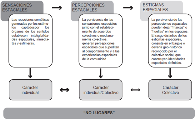 La transformación de espacios en lugares: el geógrafo Yi Fu Tuán advertía en su clásico libro Topofilia (2007), los lazos de afectividad que convierten a los entornos en espacios significativos, generadores de reacciones y emociones en quienes los experimentan y viven. El autor parte del concepto de que "(...) la topofilia es el sentimiento que experimenta el hombre por un lugar". El residir o permanecer en un espacio que genera sensaciones de bienestar, con el tiempo, se traducen en frases como "mi lugar en el mundo". Por el contrario, los sitios que provocan reacciones de rechazo, inseguridad y malestar, conforman espacios a ser evitados y los denomina topofóbicos. Las emociones y reacciones que generan los espacios en los individuos, sean positivas o negativas, les otorga identidad y reconocimiento, es decir se convierten en lugares. Asimismo, el sociólogo francés Marc Augé en su libro "los no lugares. Espacios del Anonimato" (1992), complementa quizás la distinción realizada por Tuán al esbozar el concepto de "no lugares" definiéndolos de la siguiente manera: "Si un lugar puede definirse como lugar de identidad, relacional e histórico, un espacio que no puede definirse ni como espacio de identidad ni como relacional ni como histórico, definirá un no lugar." (Augé, 1992, p. 44). En términos de Augé, éstos no lugares, conformarían en cierto modo "espacios neutrales", no generadores de emociones, asociados por lo general a sitios de tránsito, como aeropuertos, terminales de buses, shopping, entre otros, donde los individuos, por la vorágine y la experiencia efímera, no logran establecer vínculos de afectividad.