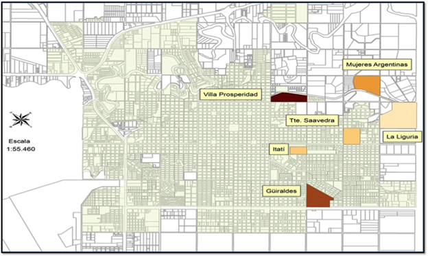 El mapa refleja las seis entidades barriales, considerados por los encuestados como las más inseguras de la ciudad. La intensidad de los colores de las figuras, es directamente proporcional a la coincidencia avizorada en los resultados de la encuesta: Villa Prosperidad, ubicada al norte de la ciudad constituye el barrio percibido como más inseguro, seguido por Güiraldes, Mujeres Argentinas, Itatí y Tte. Saavedra en igual nivel y La Liguria.