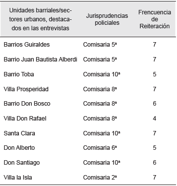 Como es posible advertir, existe una coincidencia en señalar al Barrio Güiraldes y a Villa Prosperidad como los más inseguros. El resto de unidades barriales en su mayoría, son espacios colindantes a éstos dos. Al ser consultados por las razones o causas por las cuales consideran a éstos barrios más inseguros, las respuestas obtenidas por parte de las autoridades hicieron referencia a la frecuencia de llamadas de emergencias o volúmenes de denuncias recogidas en las comisarías policiales de dichos barrios.