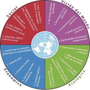 En cada uno de los pilares de la sustentabilidad definidos por la Red Global de Ecoaldeas: el social, el ecológico, el cultural, el económico y el diseño de sistema completo, es posible identificar una variedad de ecologías de saberes creadas por los mismos ecoaldeanos en su intención de reconectarse con la naturaleza. Ecologías de saberes que logran ser el resultado de un entretejido de saberes y de prácticas ancestrales, campesinas, urbanas, científicas y tecnológicas, soportadas en los principios de la sustentabilidad y del buen vivir. Estos principios integran una serie de valores que los mismos ecoaldeanos han definido de manera autónoma y que constituyen un modelo de ética simbiótica, siendo el valor del amor el eje fundamental que motiva el cuidado del tejido de la vida en espiral.