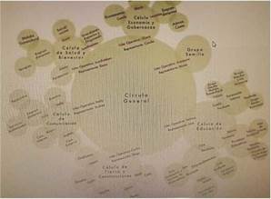 La herramienta de organización social acogida en el proceso de estas dos comunidades es la sociocracia. Razón por la cual, Aldea Feliz y Anthakarana se autoconciben como organismos vivos, que tienden auto-organizarse y autocorregirse. Aldea Feliz se ha organizado por células temáticas de acuerdo con sus necesidades. Cada célula en su interior cuenta con integrantes que cumplen roles y funciones específicas, allí se toman decisiones relacionadas con la temática de la célula, se establece comunicación con otras células y con el círculo general donde todas las células cuentan con participación y se deciden asuntos de gran relevancia para la comunidad. La sociocracia se constituye en una ecología de saber por cuanto teje distintas disciplinas científicas. En su aplicabilidad, se incorporan además distintas formas de asamblea como son los círculos de palabra o las consultas espirituales, que tienen una procedencia ancestral (Ver Figura 9).