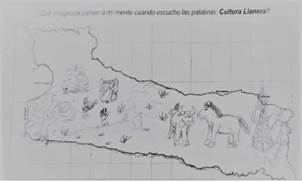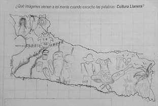 En esta sesión se presentó a los maestros una cuartilla horizontal de tamaño carta, en donde se encontraba dibujado el mapa de aquello que se entiende como suelo urbano de Villavicencio (Meta), y en la que se plasmó la siguiente pregunta: ¿Qué imágenes vienen a mi mente cuando escucho las palabras: "Cultura llanera"? (Ver Figura 1)