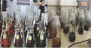 Se tomó con un sacabocado 10 mm2 de cada hongo previamente crecido en PDA y se transfirió a un erlenmeyer con 100 ml del medio de cultivo glucosa-peptona (2:1) y se dejó con agitación constante, durante una semana. De cada suspensión, se tomó 2 ml de medio, el cual se depositó en un erlenmeyer que contenía 200 ml de PVK líquido con púrpura de bromocresol al 1%. Se utilizaron tres repeticiones por cada microorganismo. Los testigos fueron los mismos medios de cultivo a los cuales se adicionó 2 ml de agua destilada estéril. Los cultivos se mantuvieron en agitación a 100 rpm (Método A, Figura 1a), y aireación (Método B, Figura 1b), a temperatura ambiente (28-30oC) por 15 días.