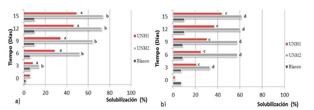 La eficiencia solubilizadora de fósforo (ESF) con el Método A presentó un porcentaje mayor con un 73,8% para UNHI y 49%, para UNH2, mientras que con el Método B se obtuvo 62% y 44% respectivamente.