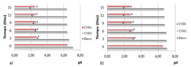 Con ambos métodos se presentó la acidificación de los medios de cultivo pasando de un valor neutro a valores por debajo de 1,75 (Yauyo, 2015), este comportamiento se esperaba, debido a que estos microorganismos habitan en suelos ácidos (Cisneros y Sánchez de P, 2015) y al producir más ácidos orgánicos de bajo peso molecular, la tendencia de acidificación es creciente. En otros estudios se ha demostrado un comportamiento similar (Behera, Singdevsachan, Mishra, Dutta y Thatoi, 2014).