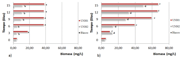 En la producción de biomasa en el medio con agitación (Método A) se obtuvieron valores de 11,20 mg/l para UNHI y 49,54 mg/L para UNH2 mientras que con el Método B se registraron valores de 38,53 mg/l y 67,30 mg/l respectivamente. Para el método con agitación (A) se observaron formaciones de colonias pequeñas muy agrupadas, a diferencia del método con aireación (B) donde el hongo esporuló uniéndose a las paredes del contenedor y en toda el área superficial de la solución.