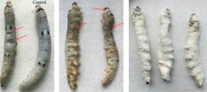 Un efecto perjudicial ocasionado por el hongo Beauveria bassiana es la infección muscardina que afecta a insectos como el gusano de seda, lo cual se confirmó en estudio realizado por la Escuela de Biotecnología e Instituto de Investigación de Sericultura en China; donde todos las larvas del gusano de seda se infectaron con la inoculación del hongo murieron y las larvas de control no se afectaron (Dingding, et al. 2017), en la Figura 2, se muestra como fue la evolución de la infección hasta ocasionar la muerte del gusano de seda. Esto lleva a tener precaución durante la aplicación del bioinsecticida sobre todo en lugares cercanos al donde se registren actividades de sericultura.