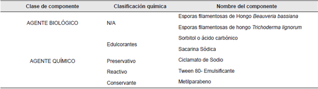 El Bioinsecticida del estudio con formula mejorada contiene componentes biológicos y Químicos relacionados en la Tabla 1, que en conjunto o de forma individual pueden llegar a generar efectos negativos a la salud humana y ambiental, tanto para los trabajadores expuestos a su manipulación, como al medio ambiente (Fernández, et al. 2015).
