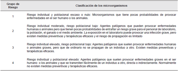 Los agentes biológicos al igual que las sustancias químicas tienen su clasificación, según la organización mundial de la salud - OMS, una de las clasificaciones es por grupo de riesgo definida en la Tabla 2. Los agentes biológicos también se clasifican según su naturaleza y orden de complejidad biológica en: Ácaros, Helmintos o gusanos, Hongos, Protozoos, Bacterias, Virus, Priones (Barraza, et al. 2014).