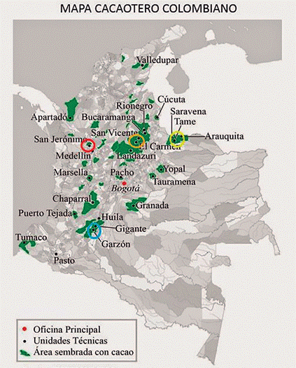 El cacao llegó a Colombia por medio de los conquistadores, los cuales iniciaron su ingreso al continente por los ríos Magdalena y Orinoco. El origen del cultivo de cacao se cree que se dio en la alta Amazonía, lo que hoy conocemos como Colombia y Ecuador, y se desplazó hace milenios hacia las civilizaciones mesoamericanas, Olmecas y Mayas, que domesticaron sus frutos (Lanaud, et al. 1994).