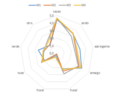 El Modelo 3 presenta mejores condiciones sensoriales, seguido del Modelo 2 y 4, quedando el Modelo 1 con mayores valores de verde, amargo y astringente, característico de lo que se manifiesta para el CCN 51 y las características de los demás Modelos 2, 3 y 4 propias de cacaos de origen trinitarios según Perea, et al. (2013).