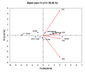 El consolidado de los resultados en el ACP de la Figura 11 permite establecer una mayor tendencia de los Modelos 2 y 4 a los sabores básicos de cacao, astringente, ácido y amargo, los Modelos 1 y 4 se encuentran en los extremos opuestos, especialmente el Modelo 1 tiene una correlación positiva para ambos factores y cercano a los sabores ácido, astringente y amargo. El Modelo 3 tiene una correlación positiva con el factor 1 y negativa con el 2, pero con cercanía a notas de frutal.