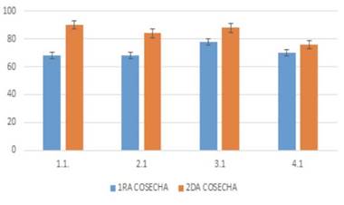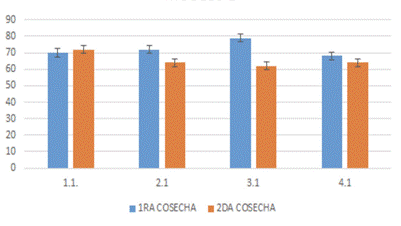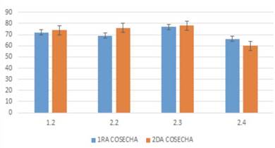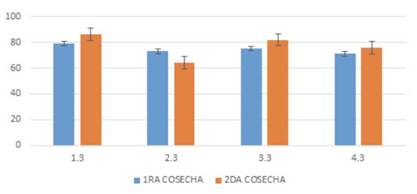 Para la primera cosecha como se observa en el Figura 8, los índices de fermentación son medios, entre 60% y 80% mientras que para la segunda ya el índice mejora a alto, posiblemente por el índice de grano que en la segunda cosecha fue inferior a la de la primera.