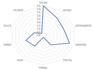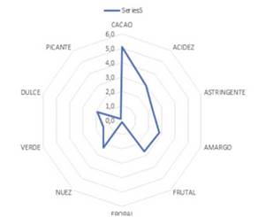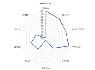 De acuerdo a la Figura 3, el perfil sensorial promedio obtenido para las cuatro localidades y para este clon, de las dos cosechas coincide con perfiles obtenidos en otras mediciones realizadas por Quintana y Gómez (2012) y Perea, et al. (2013), manteniéndose los atributos de cacao, acidez, astringencia, amargo, dulce, verde, frutal y nuez; todos relacionados con el proceso de manejo postcosecha en especial con el proceso de fermentación.