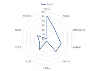 Para los sabores específicos como: el sabor frutal y nuez en poca proporción, pero presente por su naturaleza de cacaos trinitarios, los valores oscilaron entre 2,0 y 3,0 para floral y 1,8 a 2,7 para nuez. Los valores para el sabor a verde en los rangos de 0,5 a 2,2 son más altos en las muestras de San Vicente de Chucurí y Gigante estando relacionados con los porcentajes de fermentación obtenidos. Como otros, se considera el sabor dulce el cual presentó notas bajas en todas las muestras entre 1,0 y 2,0.