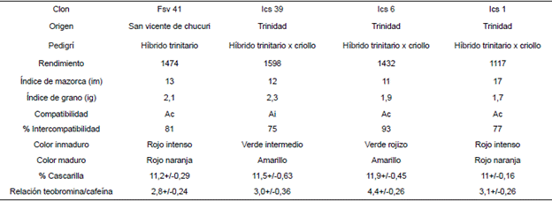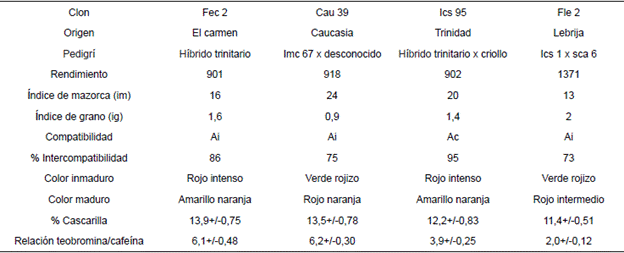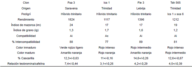 De acuerdo a lo anterior en el año 2016 Fedecacao en su guía técnica para el cultivo del cacao (Federación Nacional de Cacao, sf) presenta la matriz de compatibilidad sexual de los clones más utilizados en Colombia, que permite establecer de acuerdo al grado de compatibilidad las posibles combinaciones que se quieran conformar, teniendo en cuenta los porcentajes de compatibilidad de cada uno de los clones que influyen en la productividad de la plantación, también presentan los modelos de cacao por características específicas como son materiales más intercompatibles, resistencia a Monilia y escoba de bruja, autocompatibles, grano uniforme, perfil sensorial especial y porte medio-bajo del árbol.