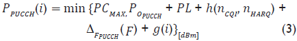 El ajuste de la potencia de transmisión en el UE para el Canal Físico de Control en el Enlace de Subida (PUCCH, Physical Uplink Control Channel) en la subtrama i es definido por la ecuación 3: