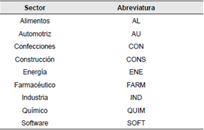 Panel B: Sectores representados en el ranking y sus siglas en este trabajo