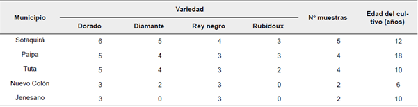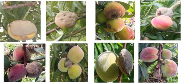 El trabajo inició con una colecta en huertos comerciales de duraznero ubicados en los municipios de: Paipa, Sotaquirá, Tuta, Jenesano y Nuevo Colón, en el departamento de Boyacá (Colombia) (Tabla 1). Las colectas se realizaron en los meses de noviembre a enero de 2016. El muestreo fue aleatorio, en forma de zigzag cada 5 metros de distancia, identificando los focos de infección en donde se colectó frutos, flores y ramas afectadas por pudrición, en las cuatro variedades: Dorado, Diamante, Rubidoux y Rey negro (Petróczy y Palkovics, 2009) (Figura 1).