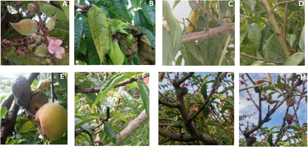 En las fincas visitadas en la zona de estudio, la enfermedad se observó en los durazneros, principalmente localizada en el tercio medio y bajo del árbol.