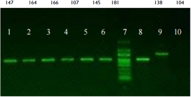 La amplificación se realizó de la siguiente manera: desnaturalización inicial de 5 min a 94 °C, 35 ciclos amplificación a 94°C, desnaturalización por 60 segundos, alineamiento a 55°C por 60 segundos y extensión de 60 minutos durante 35 ciclos a 72 °C; por último, extensión final de 5 minutos a 72 °C. Los productos de amplificación, se separaron por electroforesis en geles de agarosa 1.5% (p/v) en Tris-Acetato-EDTA, 3 μl a 100 V por una hora.