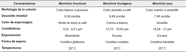 Monilia fructicola: Se identificaron 20 aislamientos de Monilia como M. fructicola, correspondiente al 62,5% de los aislamientos. Wiley & Sons (2009) reportaron la misma forma y estructura de conidióforos y conidias. Las colonias de los aislamientos JEREY-166, NUREY-164 y JEDO-107, con micelio polvoso de color café a grisáceo. Los conidióforos, presentan hifas primarias con una o varias ramificaciones antes del primer septo, formadas en cadenas, oscilan entre 12,0-9,21 μm. Los conidios son elipsoides, ovoides o alimonados. Presentan abundante esporulación de color crema.