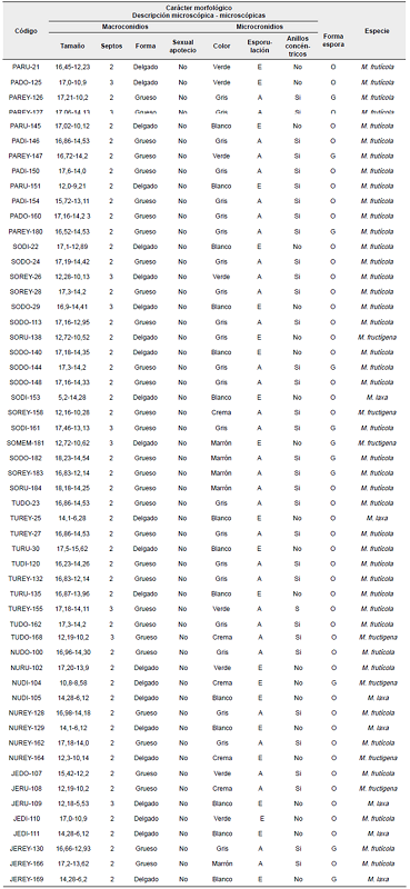 En las Tablas 2 y 3 se resumen algunas características macro y microscópicas generales observadas y las específicas de cada uno de los aislamientos de Monilia obtenidos.