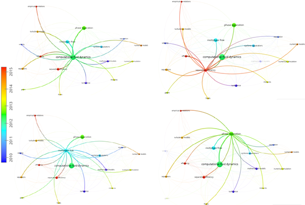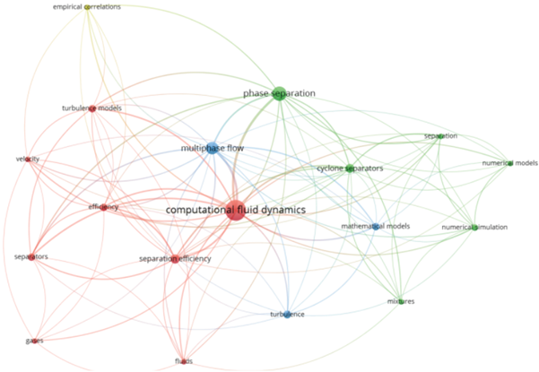 En la Figura 1 se observan claramente tres grupos o clusters, el diámetro de circunferencia refleja el peso de las KW+, adicionalmente el espectro de los colores muestra la evolución temporal del estudio. Los colores que tienden a rojo evidencian interés actual de la comunidad científica, pudiendo concluir que la eficiencia de separación en conjunto con Dinámica de Fluidos computacional (CFD) son esenciales para entender el proceso y diseño de la separación de fases del gas natural, foco principal del presente estudio, tal como se muestra en la Figura 2.