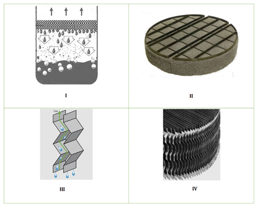 Eliminadores de niebla (demister): Su estructura consiste en una malla de alambre tejido (wire mesh, Figura 10-I-II) o una serie de placas (vane pack, Figura 10-III-IV); las cuales por medio de mecanismos de impacto, cambio en la dirección de flujo, cambios de velocidad y coalescencia, remueven las gotas más finas de la fase gaseosa. Las mallas se utilizan principalmente para retirar gotas en el intervalo de 10 a 100 μm con la desventaja de tener tendencia al ensuciamiento por lo que su uso se limita a scrubbers, o mezclas con contenido de líquido menor al 4%vol. Las placas paralelas utilizan la inercia de las gotas de líquido en la corriente gaseosa para formar una película en la superficie de la placa (Setekleiv, 2012).