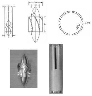 Ciclones de flujo axial: Los dispositivos AFC (Axial Flow Cyclone) constan de una configuración cilíndrica, tal como se observa en la Figura 7. El flujo a través de esta tubería es puesto en rotación gracias a un "generador de remolino" (swirl generator), el cual consiste en una geometría cilíndrica con una serie de paletas instaladas que otorgan un componente tangencial al flujo axial. Aguas abajo del generador de remolinos, en la sección de asentamiento o separación; la rotación del flujo obliga a las gotas a moverse a la pared exterior, donde se eliminan a través de rendijas o anillos anulares (Swanborn, 1988). Desde la época de los 90's se han venido publicando en la literatura diferentes esquemas para los AFC (Burkholz, 1989; Verlaan, 1991; Nieuwstadt, 1995; Hoffman, 2002). El más reciente se denomina diseño Sheffield; las dimensiones y principales características se muestran en la Figura 11.