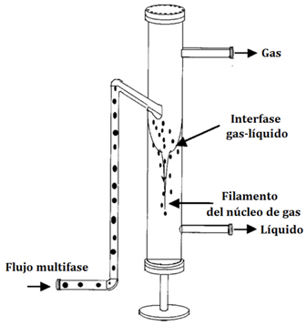 Los separadores tipo ciclón utilizan fuerza centrífuga para separar componentes de distintas fases y densidades, la fuerza que actúa sobre las gotas de líquido es cinco veces mayor que la gravedad en equipos grandes, a bajas velocidades y hasta 2000 veces en equipos pequeños a alta presión. El separador ciclónico es reconocido y aceptado en variedad de aplicaciones, desde condensado de vapor hasta polvos de hornos (Cao y Bian, 2019; Shuyan Wang et al 2019; Wasilewski y Brar, 2019). En este equipo, el gas portador y las gotas en suspensión entran tangencialmente en una sección cilíndrica o cónica del separador, tal como se observa en la Figura 12. Posteriormente, la mezcla forma un espiral hacia abajo, forzando la materia en suspensión más pesada contra las paredes. Las gotas de condensado humedecen la pared, formando una película descendente, la cual se retira por la parte inferior (Bahadori, 2014).