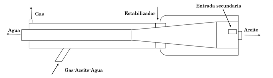Movafaghian et al (2000), estudiaron experimentalmente el comportamiento hidrodinámico de los separadores GLCC (Gas-Liquid Cylindrical Cyclone) utilizando mezclas aire-agua para 3 geometrías, 4 viscosidades de líquido, 3 presiones de operación (101,3 - 273,6 - 487,2 kPa) y el uso de un surfactante. A pesar que los estudios no superan los 5 MPa, se comprobóque a medida que aumenta la presión de operación dentro del sistema, la densidad del gas aumenta, incrementando el arrastre de líquido por la corriente gaseosa. Shoubo Wang et al, 2003 realizaron estudios experimentales junto con la implementación del modelo mecanístico desarrollado por Gomez et al, 2000, el cual es dependiente del patrón de flujo (anular y de niebla), donde el arrastre de líquido se calcula por la correlación de Wallis (1969) para el análisis de la separación por GLCC de gases húmedos a bajas presiones; con base en los resultados encontrados para mezclas aire-agua, se halló una forma interesante de abordar el problema de separación de mezclas de gas natural ricas en hidrocarburos líquidos; recomendando realizar algunas modificaciones al equipo original: adicionar un AFE (Annular Film Extractor) y una tubería de regreso de líquido para drenar el efluente de la AFE con el fin de aumentar la eficiencia de separación. Elsayed y Lacor (2012) con la ayuda de redes neuronales de tipo RBF (Radial Basis Function) realizaron el modelado y optimización pareto de ciclones cónicos, obteniendo resultados satisfactorios si se quisiera optar por una alternativa al ya recomendado GLCC para gas natural. En el caso de las separación gas-condensado-agua, Yu et al. (2013), patentaron un modelo de separador equipado con una cámara cilíndrica encajada en un ciclón de doble cono, con una entrada tangencial rectangular y una salida coaxial. Zhang et al. (2014), realizaron una actualización a la patente de Yu et al. (2013), en donde se separan las dos fases líquidas (condensado y agua) y salen por boquillas diferentes del ciclón (Figura 13).