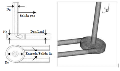 Erdal y Shirazi (2004), realizaron mediciones experimentales del patrón de flujo en separadores ciclónicos utilizando la técnica de Laser Doppler Velocimeter (LDV), posteriormente realizó simulaciones con CFD aplicando los modelos de turbulencia k-e y RSM (Reynolds Stress Model); para ambos modelos de turbulencia utilizaron inicialmente un esquema híbrido de discretización y posteriormente fueron aumentando la precisión con esquemas Upwind de segundo orden y QUICK (Quadratic Upstream Interpolation for Convective Kinematics). El autor concluye que al aplicar esquemas de discretización de orden alto al modelo RSM se generó inestabilidad en la convergencia y que el modelo k-e representó mejor las características del proceso. Posteriormente se mediría también el flujo de remolino y los núcleos que se forman dentro del ciclón (Hreiz et al, 2014; Hreiz, Gentric y Midoux, 2011), utilizando la combinación experimental-simulación, solo que esta vez con técnicas de PIV (Particle Image Velocimeter). Los resultados proponen el uso de múltiples entradas tangenciales para generar el movimiento de remolino en el ciclón, lo que suponen que favorece el régimen de inversión de flujo doble, y por lo tanto, mejora la eficiencia de separación; sin embargo, hace falta realizar más estudios. Han et al. (2013), propusieron una sencilla pero interesante modificación a la configuración convencional del ciclón (Figura 12), con el fin de analizar el efecto de la geometría y las condiciones de operación sobre la velocidad y eficiencia de separación. La Figura 16 corresponde a la nueva geometría propuesta, con la cual utilizaron el enfoque Euleriano y el modelo de turbulencia RSM para las simulaciones numéricas con CFD. El los autores modelo RSM predice adecuadamente el patrón de flujo tipo remolino, la velocidad axial, velocidad tangencial y caída de presión en simulaciones con ciclones. A partir de los estudios con CFD, se determina que el diámetro de entrada de la mezcla y el diámetro del separador son los parámetros que influyen en la calidad de la salida del gas y la caída de presión.