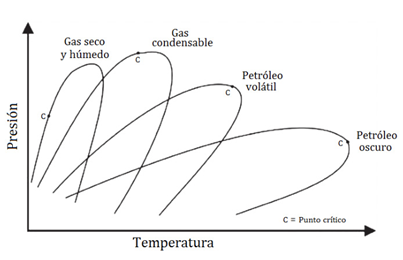 Durante el diseño de sistemas de separación, la curva de equilibrio termodinámico indica los límites de las variables y las condiciones de operación para las cuales es favorable la separación de fases del gas natural. Cronquist (1979) clasificó los yacimientos de hidrocarburos en cinco categorías (Figura 6): gas seco, gas húmedo, gas condensable, petróleo volátil y petróleo oscuro o pesado.