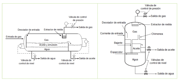 Existen tres principios físicos fundamentales para la separación de fases en equipos gravitacionales: cantidad de movimiento, sedimentación por gravedad y coalescencia. Los separadores gravitacionales pueden utilizar uno o más de estos principios. La fuerza de cantidad de movimiento se utiliza en el cambio de dirección de flujo a la entrada del separador (por medio de desviadores de flujo o elementos de choque) y por lo general realiza la separación gruesa de las fases líquidas. La fuerza gravitacional se utiliza mediante la reducción de velocidad, permitiendo que las gotas de líquido se depositen en el fondo y el gas suba al tope del separador. Adicionalmente, la segregación gravitacional permite que la fase líquida pesada descienda y la fase líquida liviana ascienda a la superficie. Finalmente, debido a la coalescencia, las gotas más pequeñas (tipo niebla) que no son separadas por gravedad, pueden unirse para formar gotas más grandes y fácilmente sedimentables. Los separadores gravitacionales se clasifican de acuerdo a su geometría como horizontales o verticales; a su función como separadores bifásicos y trifásicos, este último se utiliza cuando el gas natural además de ser rico en hidrocarburos líquidos, contiene agua Figura 7. Adicionalmente, los equipos gravitacionales pueden clasificarse de acuerdo a su presión de operación como separadores de baja (0,07 - 5 MPa), media (2 - 5 MPa) y alta (6 - 12 MPa) presión (Mokhatab, Poe, y Mak 2015).