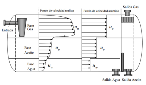 La literatura especializada, revela pocas publicaciones en el tema de separación multifase que involucre componentes del gas natural a alta presión; los diseños convencionales se realizaban basados en sugerencias de campo y suposiciones de mezclas aire-agua a presión atmosférica; dando como resultado una sobre-especificación de las variables de proceso y equipos de gran tamaño (Abernathy, W. J.,1993). Con el objetivo de eliminar estas fallas surgieron procedimientos más sistemáticos donde, por medio de algoritmos, aplican teoría de asentamiento de gota, para evaluar los requisitos de separación gas-líquido; esta teoría asume gotas perfectamente esféricas asentándose en un fluido continuo, estancado por acción de la fuerza de gravedad. Para la separación líquido-líquido, adoptan la teoría de tiempo de retención, la cual utiliza datos de coalescencia y asentamiento experimental para estimar el tiempo que las diferentes fases deben permanecer dentro del separador para que el proceso se lleve a cabo (Monnery y Svrcek, 2000), adicionalmente, muestran un algoritmo para el dimensionamiento de separadores gravitacionales horizontales y verticales, los cuales han venido siendo actualizados con el fin de utilizar cada vez menos suposiciones y simplificaciones que se alejan de la realidad. Grodal et al, (1999) desarrollaron un paquete de software para el diseño de separadores horizontales bi y trifásicos aplicando técnicas de SQP (Sequential Quadratic Programming) y utilizando la teoría de asentamiento de gota. Para la solución del problema realizaron la suposición de un patrón de flujo tipo pistón, tal como se observa en la Figura 8. Esta suposición no es del todo acertada debido que quebranta la condición de "no deslizamiento" en la pared y en las interfaces; sin embargo, es un buen comienzo para sentar las bases del proceso de separación gravitacional.