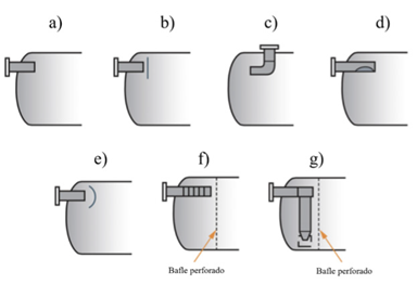Desviadores de entrada: Su objetivo es mejorar el desempeño del proceso, haciendo la separación gruesa de las fases, minimizando el cizallamiento de las gotas, mejorando las distribuciones de velocidad de cada una de las fases separadas aguas abajo del desviador. La Figura 9 muestra los diferentes tipos de desviadores de entrada. Para sistemas de alta capacidad y exigencia en eficiencia de separación, se recomienda el uso de desviadores tipo placas paralelas (f) o ciclón (g); mientras que los dispositivos más simples se utilizan cuando la eficiencia de separación no es una variable (Arnold y Stewart, 2008; Chin, Stanbridge y Schook, 2002). Los desviadores de entrada normalmente se seleccionan o clasifican según el momento de entrada (o presión dinámica) de la corriente de alimentación del separador, el objetivo es reducir la energía/velocidad de la mezcla de entrada, proporcionando las condiciones favorables para la separación de fases. El momento de entrada se define como