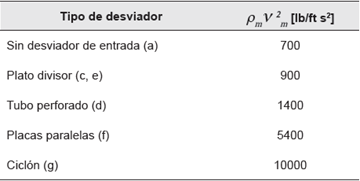 son la densidad y velocidad de la mezcla respectivamente. La Tabla 3 presenta los límites típicos de diseño para el momento de entrada de diferentes tipos de desviadores (Bothamley, et. al., 2013). La presión dinámica ofrece una luz para seleccionar el dispositivo adecuado a la entrada del separador gravitacional horizontal o vertical.