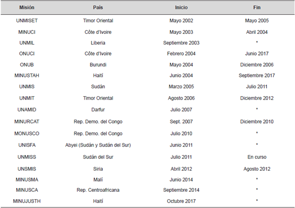 Dado que la Resolución 1325 fue publicada en Octubre de 2000, el único criterio de selección de las OMPaz es la temporalidad, situándose en 17 OMPaz (Tabla 2).