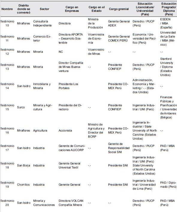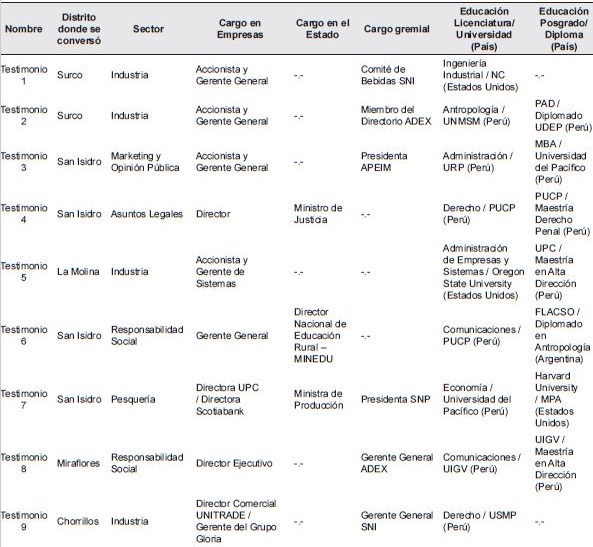 Para esta investigación, se entrevistaron a diversos miembros del sector empresarial limeño. Estas conversaciones buscaron conocer sus trayectorias profesionales dentro del contexto social que les tocó vivir. Algunas pueden ser calificadas como historias de vida y otras como entrevistas en profundidad si tomamos en cuenta el tiempo de duración.