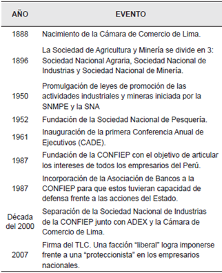 La historia de los gremios empresariales en cuanto a instituciones es relativamente reciente, remontándose a la reconstrucción nacional (1884-1895). Es dentro de ese contexto donde nace la Cámara de Comercio de Lima. Esta fue heredera del Tribunal del Consulado y fue pensada como una entidad que mediaba en los conflictos comerciales. Durante los primeros años del siglo XX, la relación entre los propietarios y los políticos fue estrecha porque en ese pequeño periodo funcionó como enlace entre ambos grupos (Ver Tabla 2).