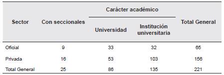 En esta etapa se estableció identificar a las IES colombianas que han publicado datos en formato abierto, considerando a las universidades o instituciones universitarias que pertenecen al sector oficial o privado, y que hacen parte de las 221 instituciones registradas en el Sistema Nacional de Información de Educación Superior (SNIES) (SNIES; Ministerio de Educación Nacional, 2019). En la Tabla 1 se presenta el desglose de las IES colombianas por sector, por su carácter académico y por las seccionales con que cuentan.