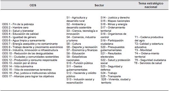 Se realizó la clasificación y análisis del contenido y formato de los datos abiertos publicados por las IES en los portales de datos abiertos seleccionados, teniendo en cuenta tres criterios: 1) la IES que publica y su carácter (público o privado) tal como se muestra en la Tabla 1 y 2) el contenido de los datos en relación con los ODS, así como los sectores y temas estratégicos definidos por el gobierno colombiano para la apertura de datos -ver Tabla 2- y 3) el tipo de vista o formato de visualización de los datos publicados.