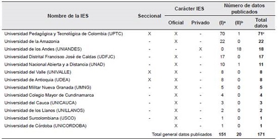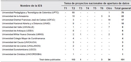 A nivel general, se identificó que la Universidad Pedagógica y Tecnológica de Colombia (UPTC) es la institución que más datos ha publicado (71), seguida por la Universidad de la Amazonia (22) y la Universidad de los Andes (UNIANDES) (18); esta última es la única universidad privada que ha publicado datos en formato abierto.