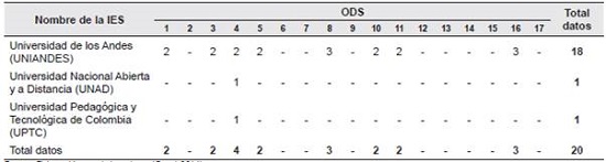 Al revisar el catálogo de datos Conecta, se encontró en las fuentes académicas que tres IES colombianas (Universidad de los Andes (UNIANDES), Universidad Nacional Abierta y a Distancia (UNAD) y Universidad Pedagógica y Tecnológica de Colombia (UPTC)) han publicado 20 conjuntos de datos para ocho de los 17 ODS, tal como se muestra en la Tabla 4. El ODS 4, Educación de calidad, es el objetivo con más conjuntos de datos (20%), seguido del ODS 8, Trabajo decente y crecimiento económico (15%), y el ODS 16, Paz, justicia e instituciones sólidas (15%). Asimismo, se abordan los ODS 1, Fin de la pobreza, ODS 3, Salud y bienestar, ODS 5, Igualdad de género, ODS 10, Reducción de las desigualdades, y ODS 11, Ciudades y comunidades sostenibles, con un 10% para cada objetivo.