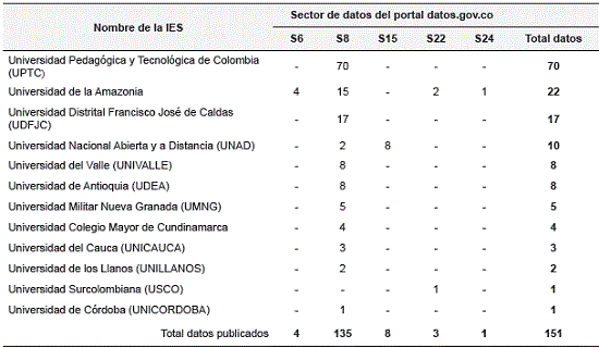 En los resultados obtenidos de la consulta en el portal nacional colombiano, se encontró que la publicación de datos de las IES se corresponde al 1,5% del total de los datos de este portal (Ministerio de Tecnologías de la Información y las Comunicaciones, 2019). Por otra parte, las 12 IES oficiales en estudio han publicado 151 datos en cinco de las 26 categorías que propone el portal. De los datos publicados se observa que el 89,4% se concentra en el sector S8, Educación, seguido por el sector S22, Salud y protección social (18,9%), S15, Mapas nacionales (5,3%), S6, Deporte y recreación (2,6%) y S24, Trabajo (0,7%). En la Tabla 5 se relaciona el número de datos publicados por IES y por sector.