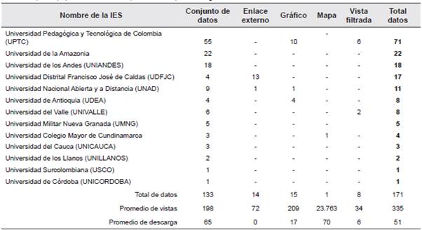 Paralelamente, se observó que los datos publicados por la Universidad Pedagógica y Tecnológica de Colombia (UPTC), como vistas filtradas (6) y gráficos (10), relacionan a datos de deserción académica y no académica, mientras que las vistas filtradas de la Universidad del Valle (UNIVALLE) (2) se asocian a inventarios de árboles del campus. Por otro lado, el mapa publicado por la Universidad Colegio Mayor de Cundinamarca muestra las sedes de la universidad y cuenta con un importante número de descargas (23.763). Por su parte, los enlaces externos publicados por la Universidad Distrital Francisco José de Caldas (UDFJC) se encuentran relacionados con datos de contratación del año 20I0 al 2016 (13) y la Universidad Nacional Abierta y a Distancia (UNAD) compartió un enlace externo con datos de convenios de descuentos de matrículas (1).