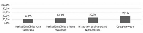 A partir del universo, 73 instituciones públicas focalizadas y 18 no focalizadas, se llevó a cabo un muestreo aleatorio estratificado (Klinger, 2006), que determinó el tamaño de la muestra: 18 instituciones focalizadas (252 estudiantes: 126 rurales y 126 urbanos) y 4 no focalizadas (56 estudiantes: 28 de públicos y 28 de privados). El primer grupo se definió experimental y las no focalizadas se tomaron como grupo control para poder hacer un ejercicio comparativo entre los resultados de estos sectores educativos. El nivel de precisión y confiabilidad fue del 0,96 y la frecuencia de ocurrencia fue del 50%.