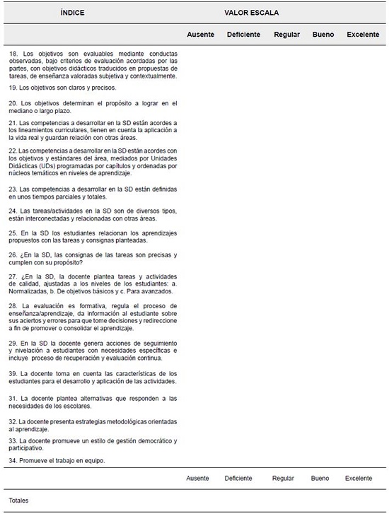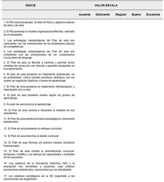 El proceso describió, analizó y evaluó la intervención educativa del PTA, abarcando varias fuentes, técnicas de recopilación de información e instrumentos. Con un primer instrumento, "Encuesta con escala Likert", propuesto por el MEN (2013) (Tabla 1 ), se revisó una fracción de lo que constituye el plan de estudios en el área de lenguaje, tomando en cuenta la información suministrada por los directivos, la docente y la tutora. A través de esta, se valoró la actualización y la pertinencia del currículo en cinco componentes que permiten ver la interactividad enseñanza-aprendizaje: a) el PEI, b) los planes de área y de aula, c) los objetivos, competencias, tareas y actividades de la secuencia didáctica, d) la evaluación y e) las acciones ejecutadas por la docente; todos estos principios ordenadores de una institución educativa. Además, se describió críticamente lo observado durante la planeación y la aplicación de la secuencia didáctica.